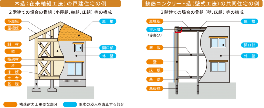 保険の対象となる部分(基本構造部分)とは、住宅の品質確保の促進等に関する法律および同法施行令で定められた柱、基礎等の構造耐力上主要な部分および外壁、屋根等の雨水の浸入を防止する部分を指します。この基本構造部分の瑕疵が保険の対象となります。