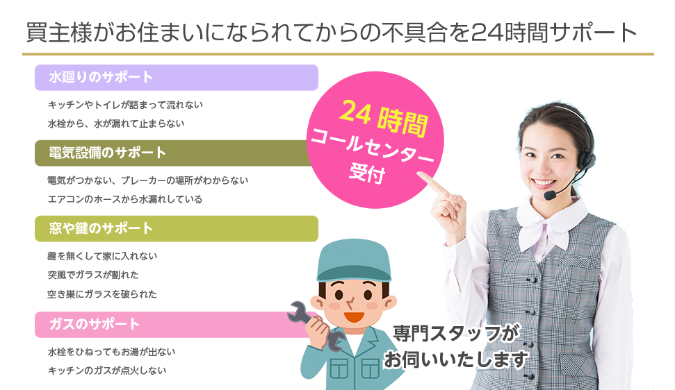 そこで、「売却の窓口R」では買主様に対して引き渡し後の24時間コールセンターをご提案しています。例えば「トイレが詰まった」「洗面台の下から水漏れが」「クロスが剥がれた」「雨戸が外れた」「照明器具の外し方がわからない」「鍵を失くした」「スイッチを押しても電気がつかない」等々、これらは実際の買主様から聞いた“困ったこと”の一部です。それらの不安に対し、24時間駆けつけ解決するのが24時間コールセンターサービスです。